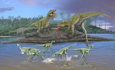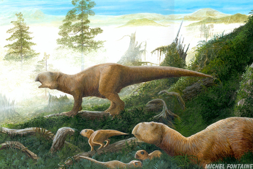 Ci-contre, un groupe de Psittacosaurus. Acrylique, 1992. Tous deux pour la galerie de Paléontologie du Muséum National d'Histoire Naturelle.