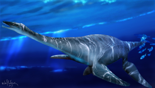A gauche, groupe de sauropodes sur une plage. Peinture numérique. 2000.